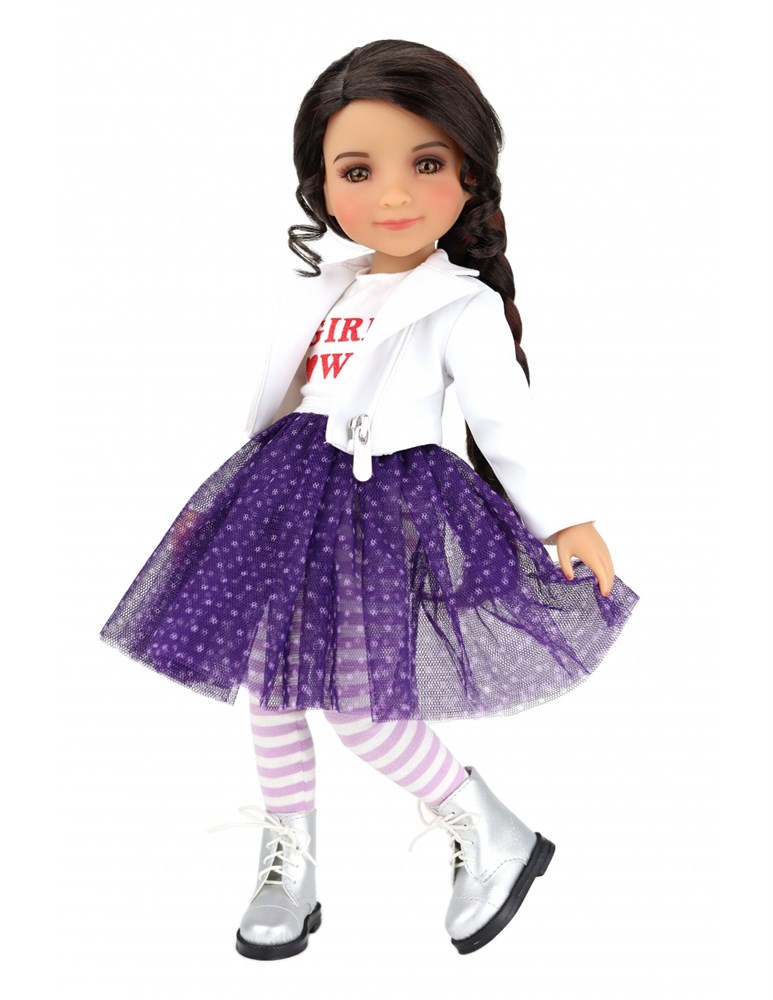 У Фрейды длинные темно-каштановые волосы, заплетенные в длинную косу, красивые глубокие глаза. На ней фирменная футболка "Girl Power", белая куртка, леггинсы в полоску, фиолетовая юбку из фатина в белый горошек и серебристые ботинки - берцы.